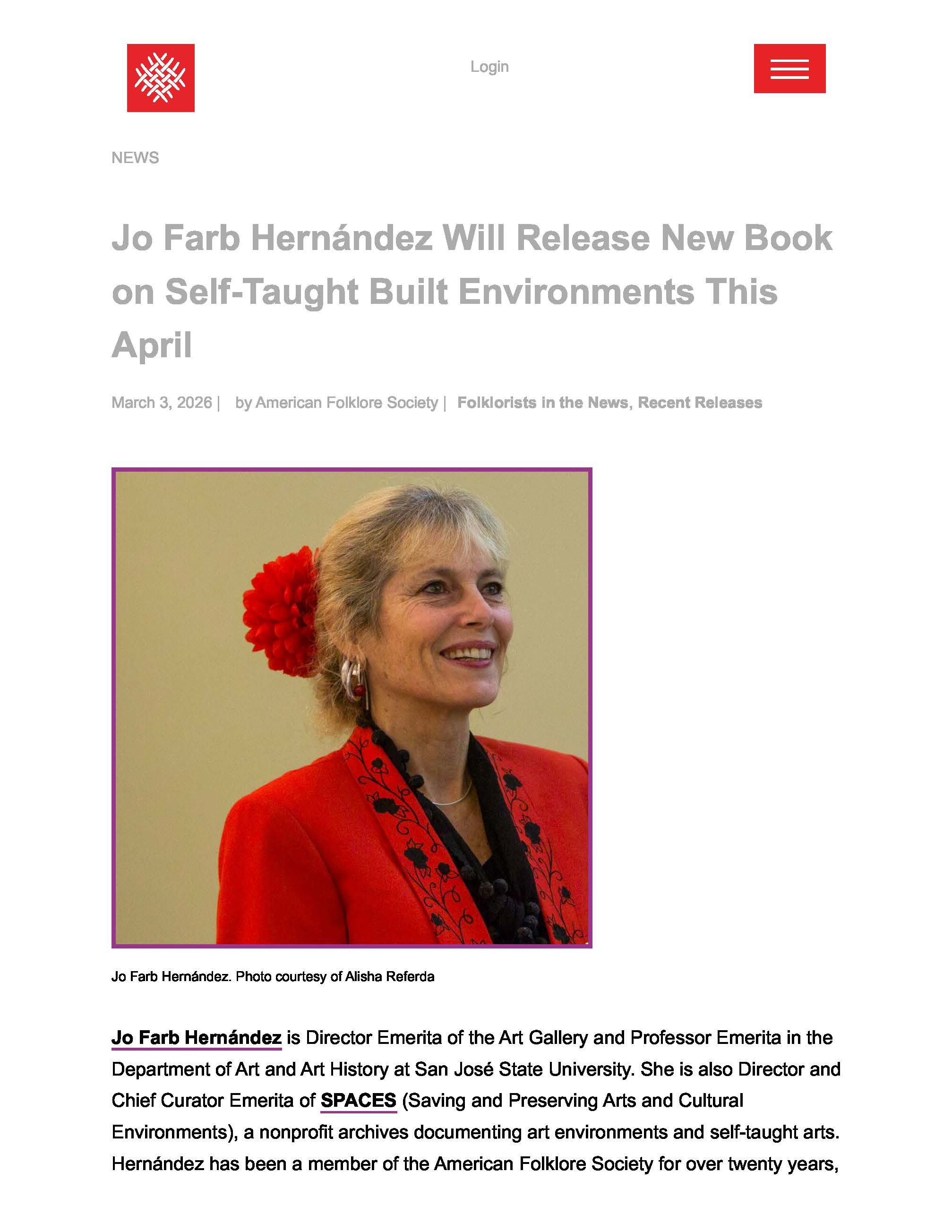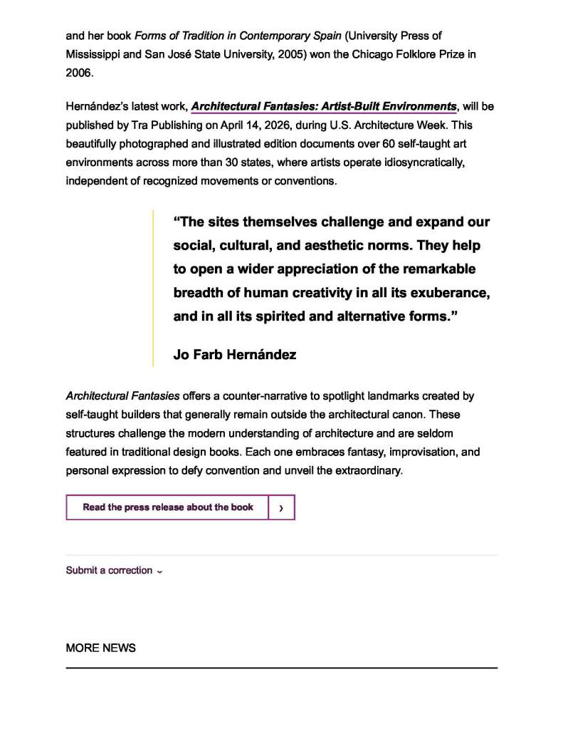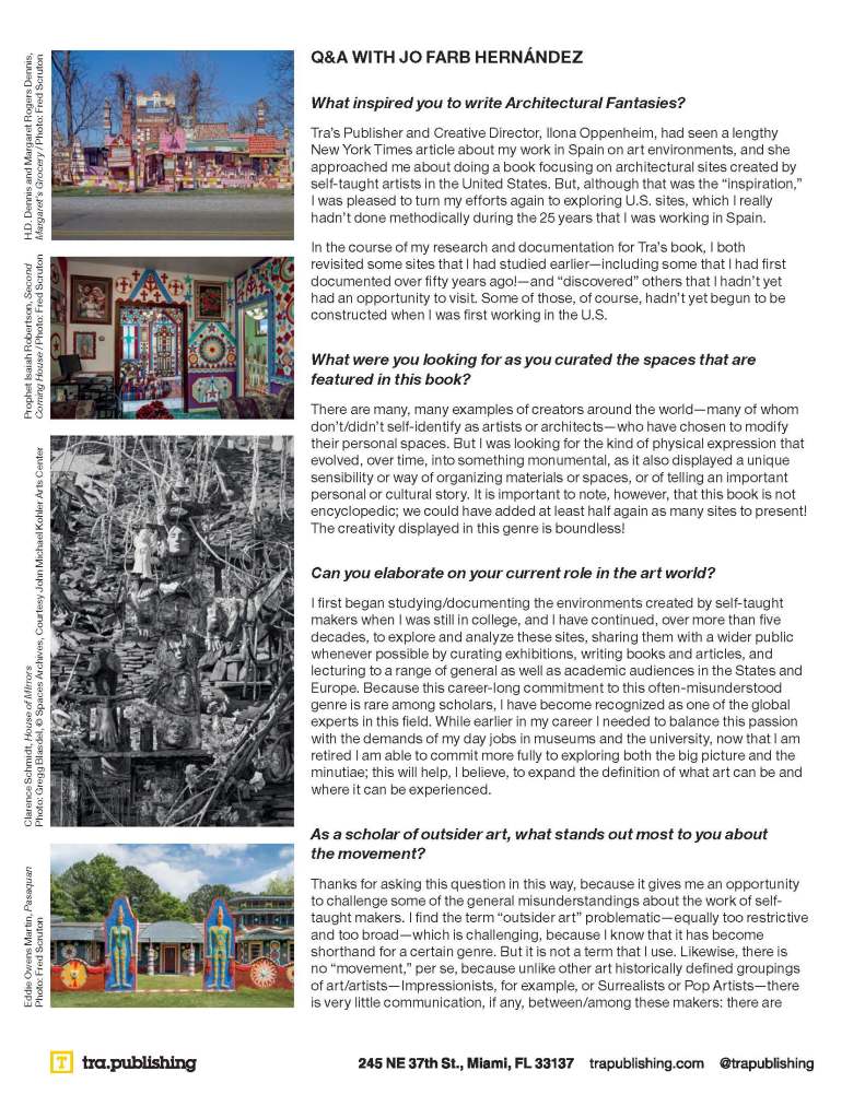 “Jo Farb Hernándezbrings a depth of knowledge to the multidimensional field of artist-built environments in her exceptional Architectural Fantasies.” –BookPage, April 2026