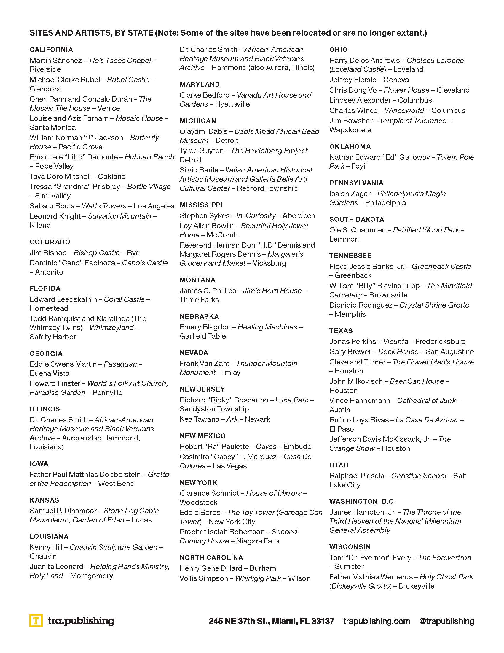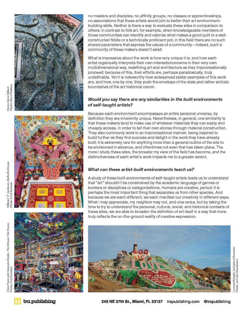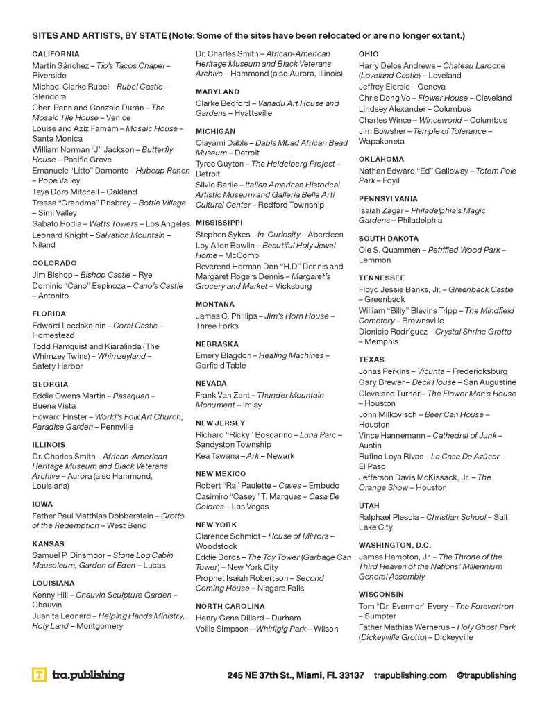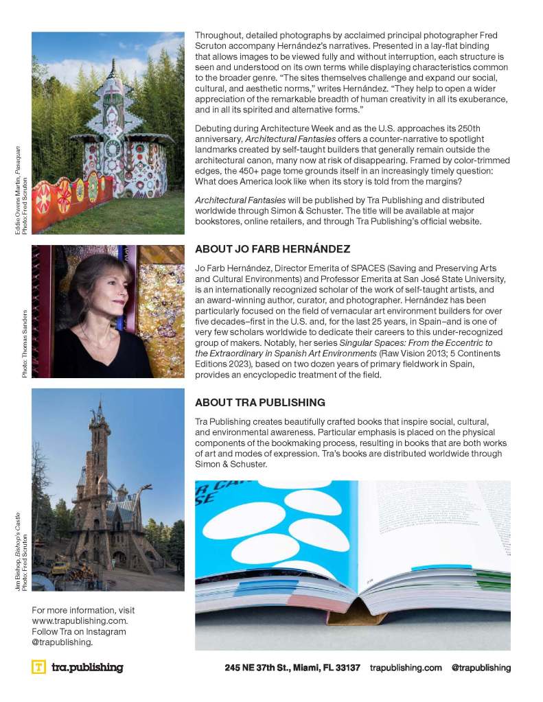 All across the United States, self-taught artists and architects, working outside of the mainstream, unite function with fantasy. The works are generally monumental, frequently provocative, often whimsical, sometimes reverential, and regularly misunderstood–but always remarkable. This book, published by Tra Publishing in mid-2026, opens a window into the passion and the innovation of some of our most creative artists and the ways they transform the spaces in which they live and work.