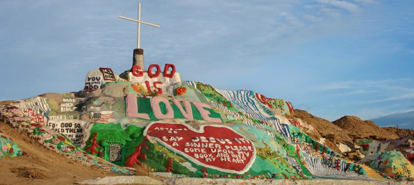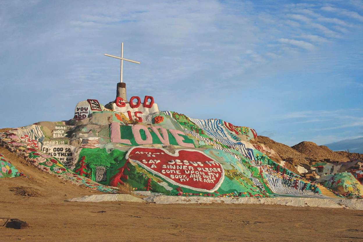 What began as a pile of dirt, rubble, and cement in rural Niland, California, just east of the Salton Sea, eventually became one of the most beloved landmarks and roadside attractions in the region. “Salvation Mountain,” Leonard Knight’s vibrantly painted, three-story mound made of adobe and straw, stands as a tribute to one man’s tenacity and desire to spread a message, topped with its instantly recognizable slogan, “God Is Love.”