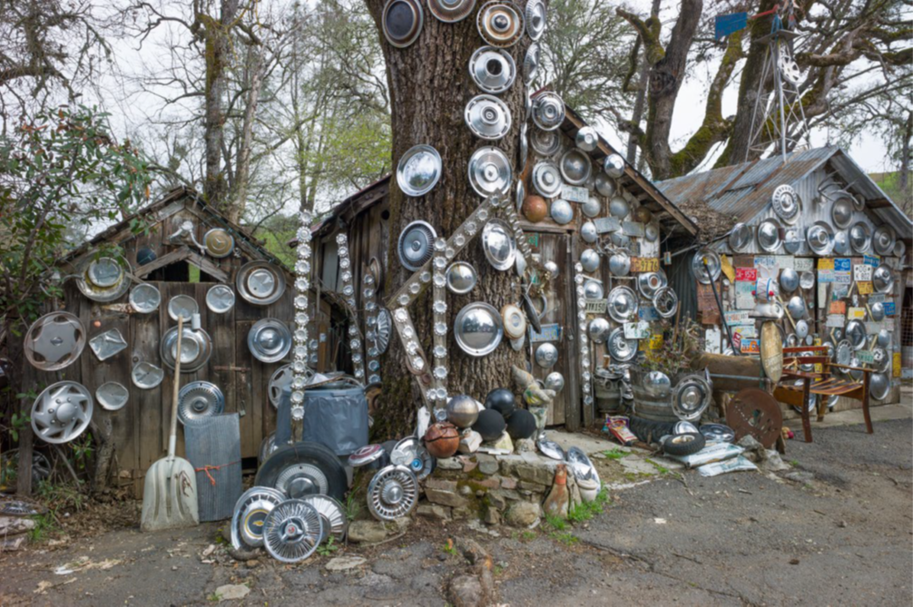 “Salvation Mountain” is just one of countless artist environments around the U.S., illustrating the unique style, drive, and vernacular of creative builders. Often driven by religious or spiritual fervor, these self-taught artists use whatever materials are at hand, from salvaged metal and concrete to rocks, shells, glass, and more. Northern Wisconsin artist Fred Smith, for example, built a sprawling “Wisconsin Concrete Garden” that’s populated by figures and animals embellished with fragments of beer bottles and other found objects. And Philadelphia’s Magic Gardens are a visual cacophony of mosaics, passageways, arches, and niches made from a huge array of materials and knick-knacks.